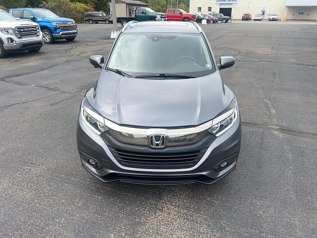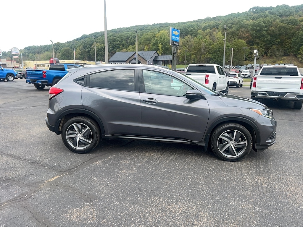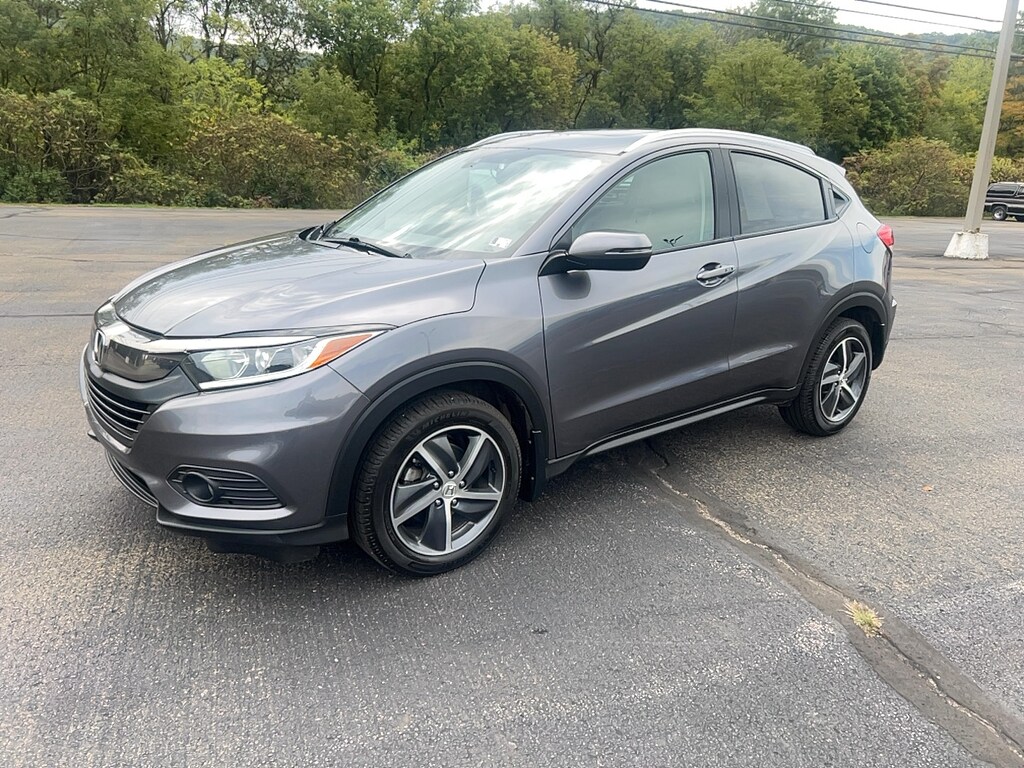 17" Machine-Finished Alloy Wheels, 4-Wheel Disc Brakes, 5.436 Axle Ratio, 6 Speakers, ABS brakes, Air Conditioning, Alloy wheels, AM/FM radio: SiriusXM, Apple CarPlay/Android Auto, Auto High-beam Headlights, Auto-dimming Rear-View mirror, Automatic temperature control, Brake assist, Bumpers: body-color, Delay-off headlights, Driver door bin, Driver vanity mirror, Dual front impact airbags, Dual front side impact airbags, Electronic Stability Control, Emergency communication system, Exterior Parking Camera Rear, Forward collision: Collision Mitigation Braking System (CMBS) + FCW mitigation, Front anti-roll bar, Front Bucket Seats, Front Center Armrest, Front fog lights, Front reading lights, Front wheel independent suspension, Fully automatic headlights, Heated door mirrors, Heated Front Bucket Seats, Heated front seats, Illuminated entry, Leather-Trimmed Seat Trim, Low tire pressure warning, Occupant sensing airbag, Outside temperature display, Overhead airbag, Panic alarm, Passenger door bin, Passenger vanity mirror, Power door mirrors, Power moonroof, Power steering, Power windows, Radio data system, Radio: AM/FM/HD Audio System (180-Watt), Rear anti-roll bar, Rear window defroster, Rear window wiper, Remote keyless entry, Roof rack: rails only, Security system, SiriusXM Radio, Speed control, Speed-sensing steering, Split folding rear seat, Spoiler, Steering wheel mounted audio controls, Tachometer, Telescoping steering wheel, Tilt steering wheel, Traction control, Trip computer, Turn signal indicator mirrors, Variably intermittent wipers. 2021 Honda HR-V EX-L 4D Sport Utility Lunar Silver Metallic AWD CVT 1.8L I4 SOHC 16V i-VTEC
